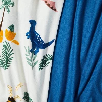 This Pack of Fitted Jersey Crib Sheets Dino-Snore from cloud island™ includes two fitted crib sheets to fit standard cribs and toddler beds. Made from 100% jersey cotton, these standard crib sheets fit nine-inch mattresses, and they’re designed with all-around elastic for a secure fit over the crib mattress. The pack includes two fitted crib sheets — one in bright blue and the other with a colorful print of different dinosaurs in a tropical woodland on a white background — to give your little one’s nursery decor a whimsical update.